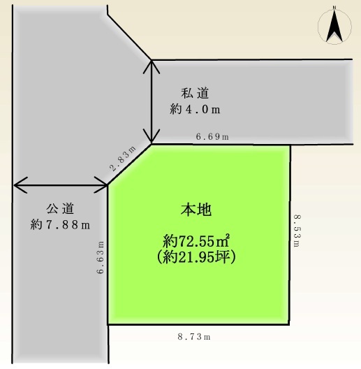 | 権利種類 | 所有権 | 接道 | 西側7.8M公道に接道 北側4M私道に接道 |