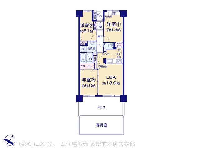 | 備考・制限等 | ペット飼育:可(小型犬、猫は双方あわせて2匹まで) 共有持分:6132.04平米×6773/1145394有 テラス面積:16.2平米 専用庭面積:13平米 専用庭使用料:650円/月 |